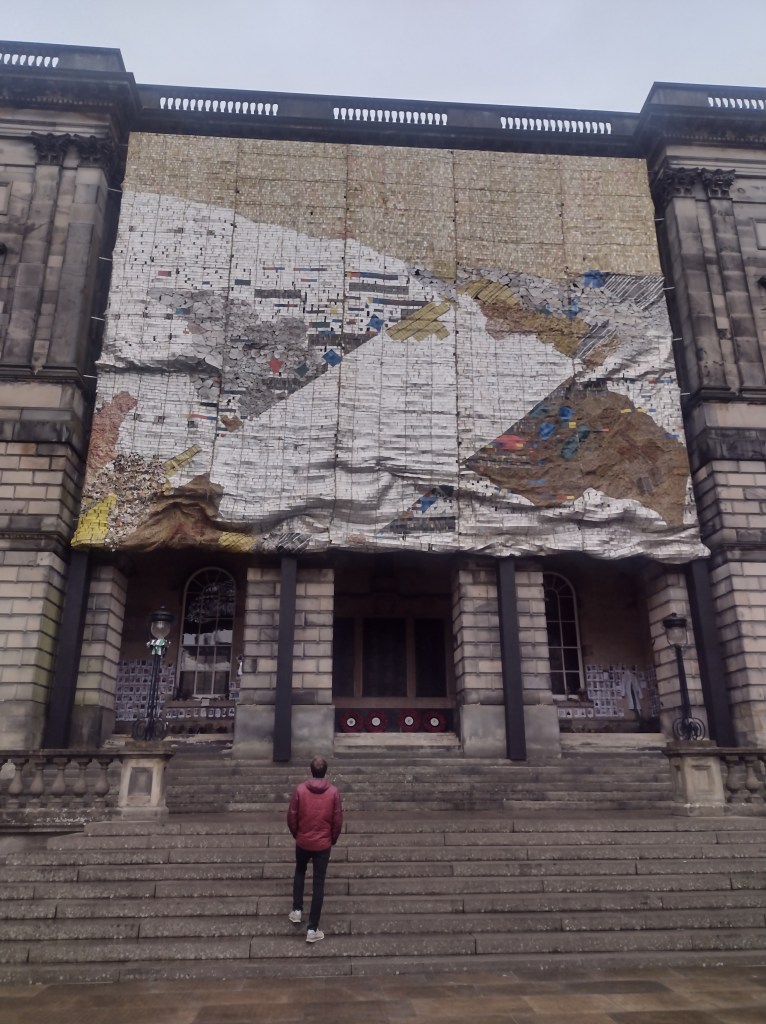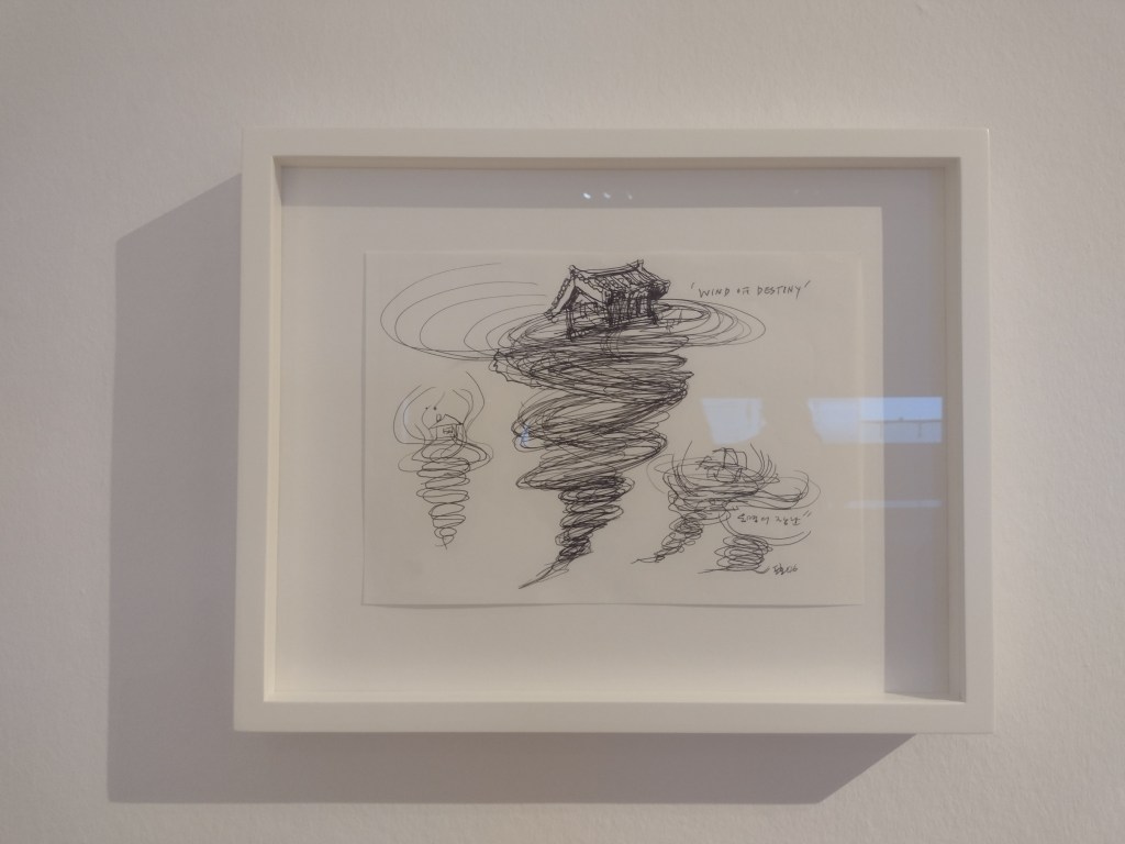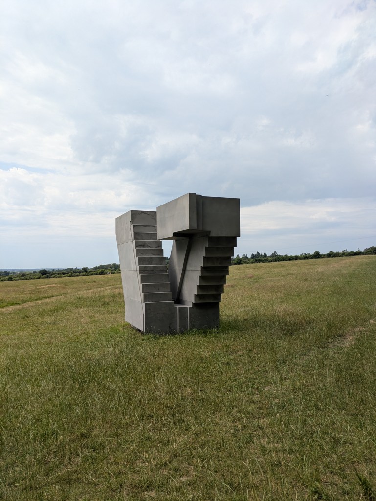 Whiteread’s unmistakable footprints appear again across the wildflower meadow, her signature concrete casting process back with Down and Up (2024-25), a staircase flung in the wide field like a strange fragment of a disappeared home. The free guide booklet contained an interview with Whiteread, where she refers to this sculptural staircase as “universal memory of a commonplace architectural form”. I cannot think of her work without feeling it is haunted, these casts of buildings capture a ghostly suggestion of a structure that once was and now isn’t there any more. It is no wonder her art is associated with memorials: her Memorial to the 65,000 Austrian Jews who were Murdered in the Shoah in the Judenplatz in Vienna is an unforgettable work. Seeing this staircase then, one cannot help but think of ruined buildings of Gaza, of destruction and war. It is inescapable.