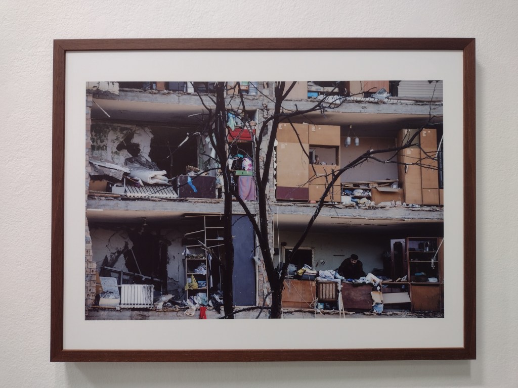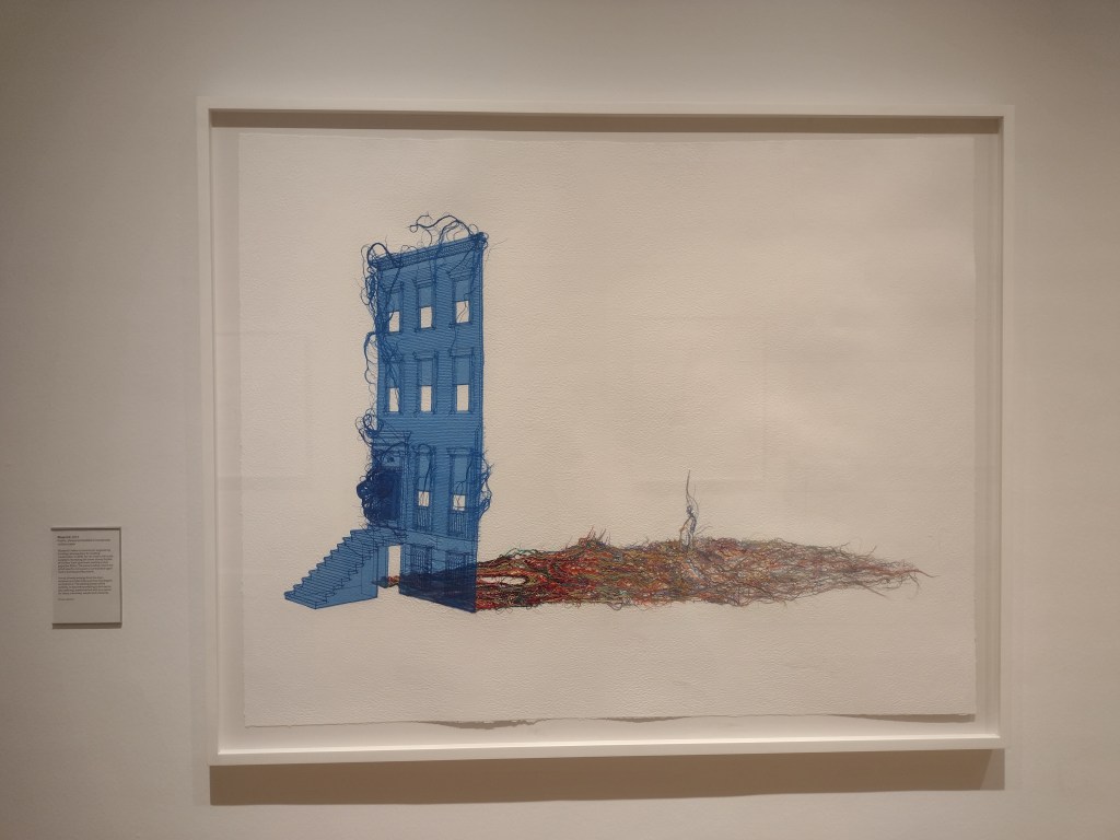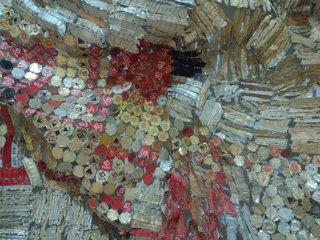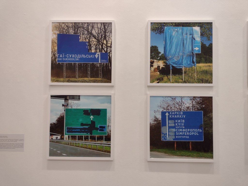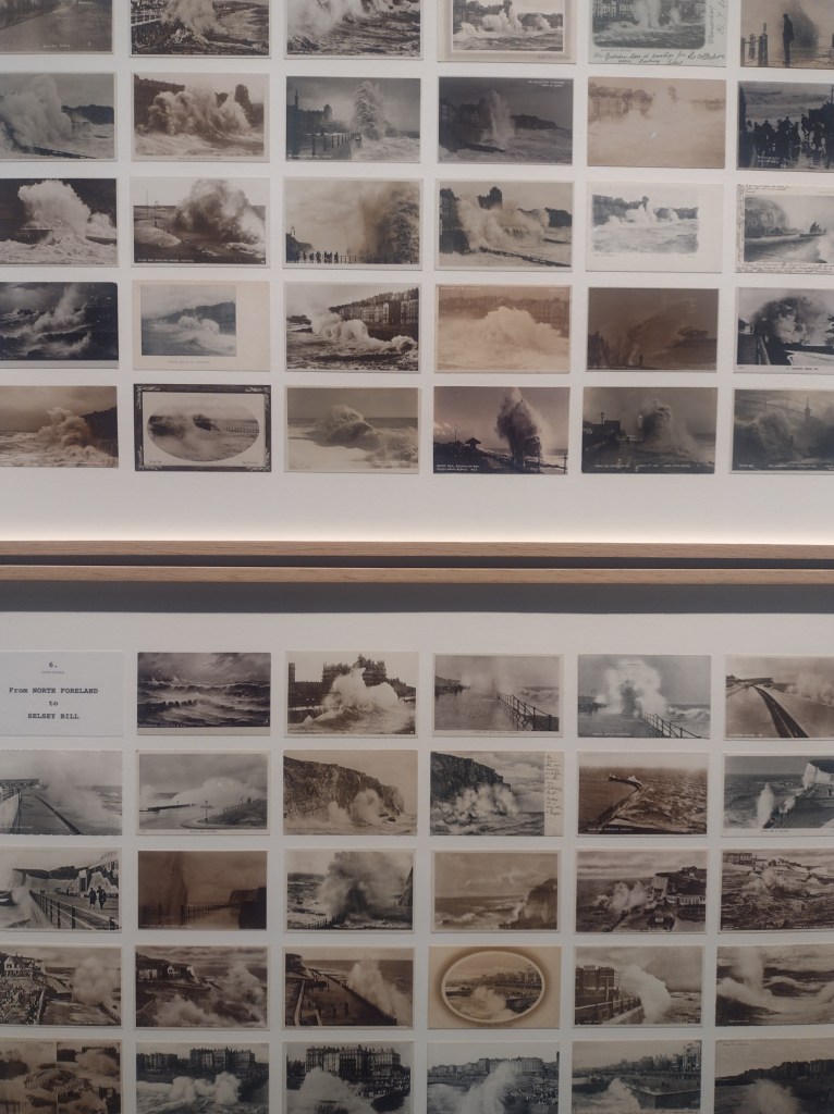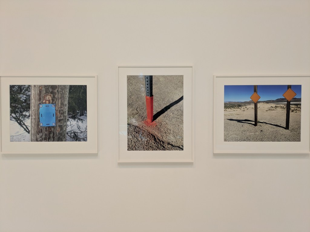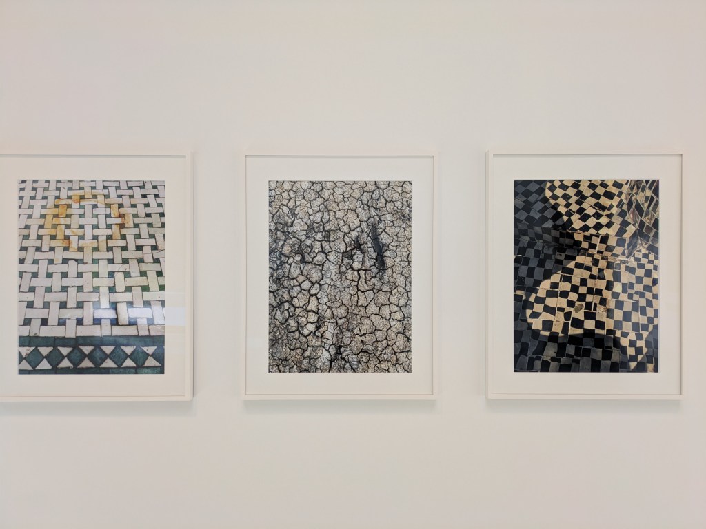 This season, Whiteread is the main focus of the larger gallery, one of two indoor art spaces at the Foundation. In the centre, the space is dominated by her work Doppelgänger (2020-21), a bright white ghost of a tumbledown corrugated iron shack, trees poking through the building’s seams. However, I was drawn to the photos on display, the first substantial showing of her photography. Her photos, like most people’s, were largely taken on her phone and capture landscapes, interesting shapes, everyday encounters with the traces of human presence, or as she says “eccentric features” that interest her. Whiteread views photographs as a form of notetaking, a sentiment which strongly chimes with me. Part of the reason for starting this blog came from a desire to capture those artistic ‘encounters’ that one meets within the city. So in Whiteread’s photos, we see fragments of colour against brown and grey of signs and posts, and the pleasing, satisfying textures of tiles, pictured side by side with dried, fragmented earth. The wall labels tells us the locations for these images: France, Rome, California, Essex, Tuscany.