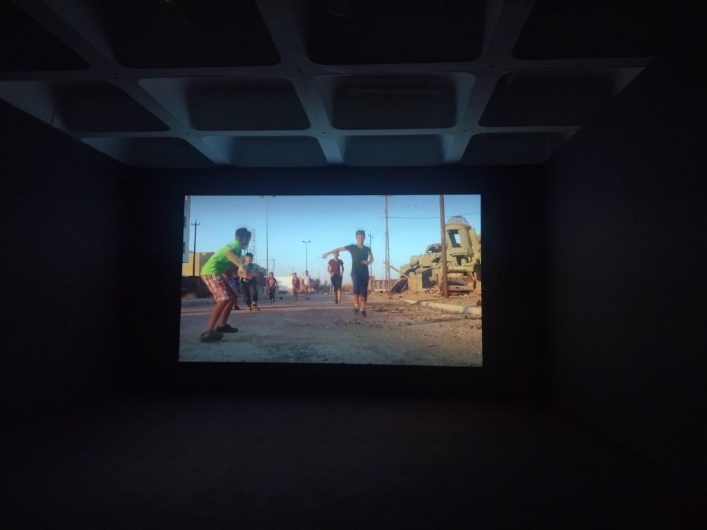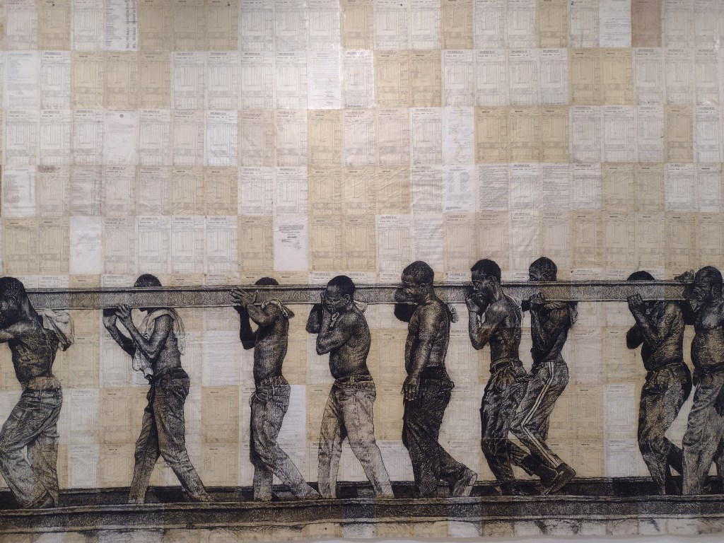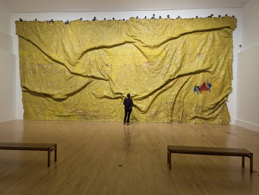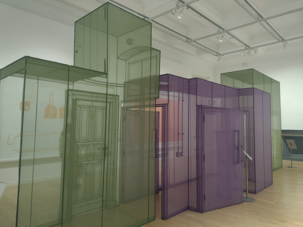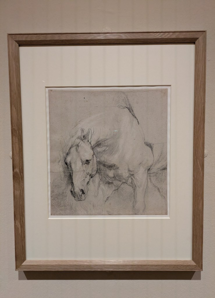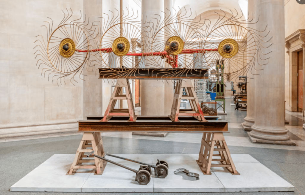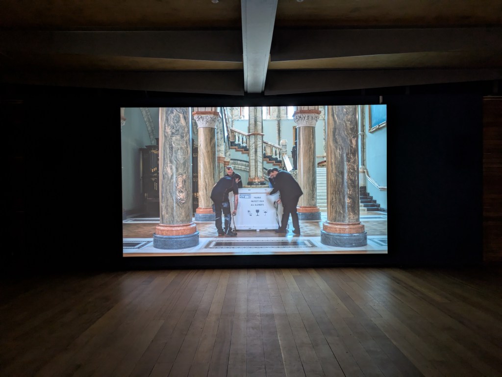 The smaller gallery space housed Amie Siegel’s Bloodlines (2022). I don’t normally engage video art for long, I’m naturally impatient. Here though, in the shade and darkness I was completely captivated by the luxurious interiors of Seigel’s film. Unnarrated, the camera drifts eerily along magnificently decorated hallways and into rooms with ticking clocks, marble pillars and strange taxidermied animal collections. We see an ‘insider’ view of huge stately homes, that are choc-full of artworks. It felt very apt that Bloodlines, which traces the movement of artworks by George Stubbs between private collections and public museums but really explores wealth, history, the legacies of ownership, class, and the strange power dynamics of who owns art and who can look at, and on whose terms that is, felt an important nod to where we were: the art collection of an actual Duke, (because yes, they’re still around), in the middle of a field in England.