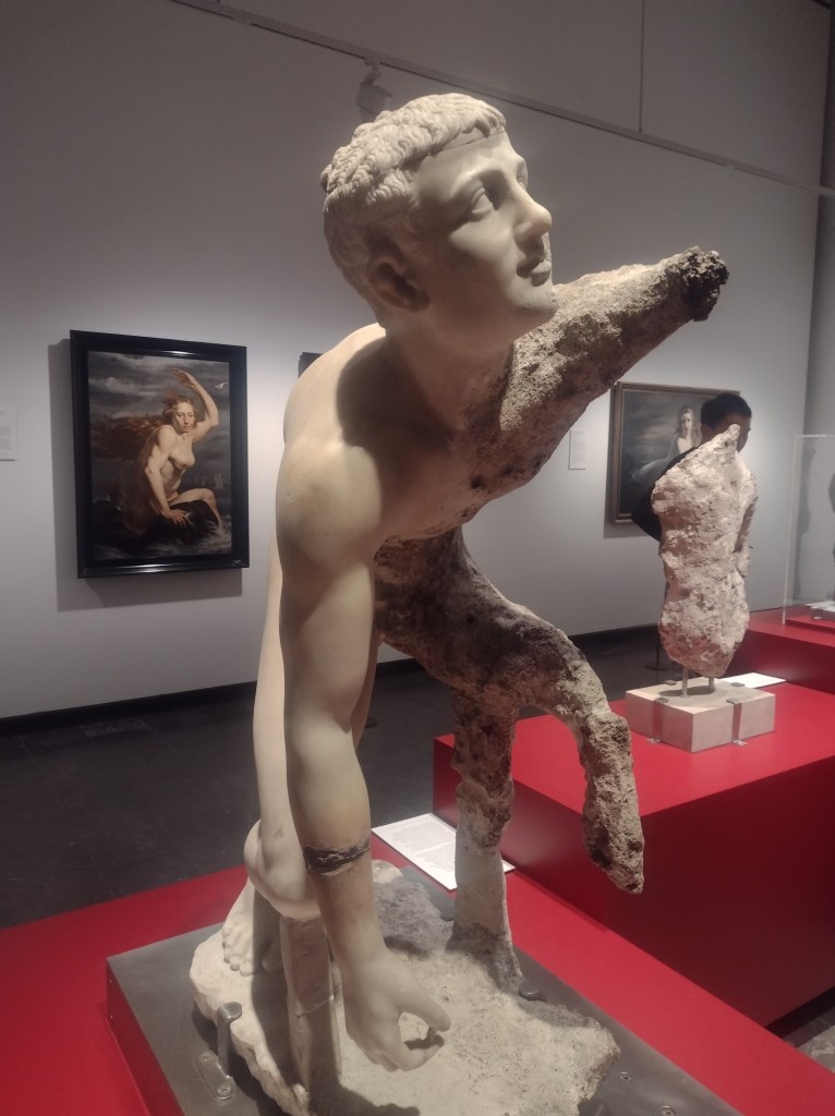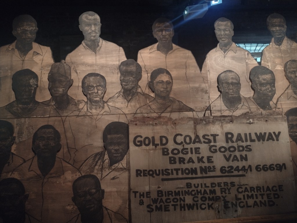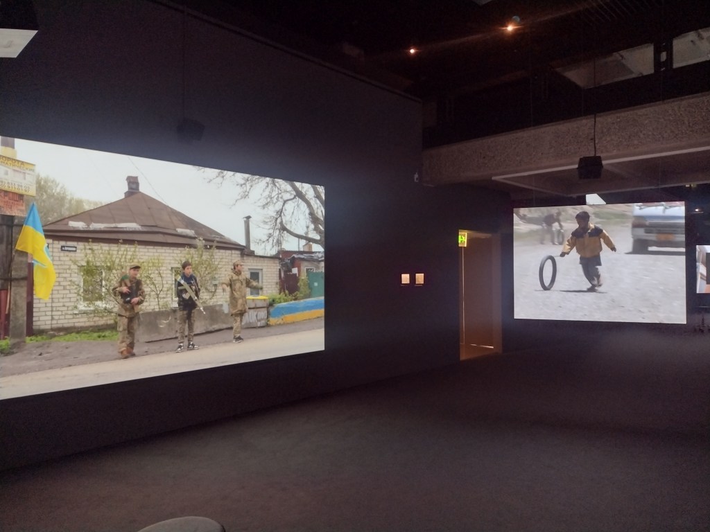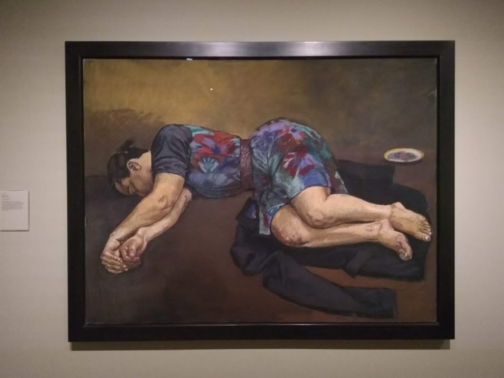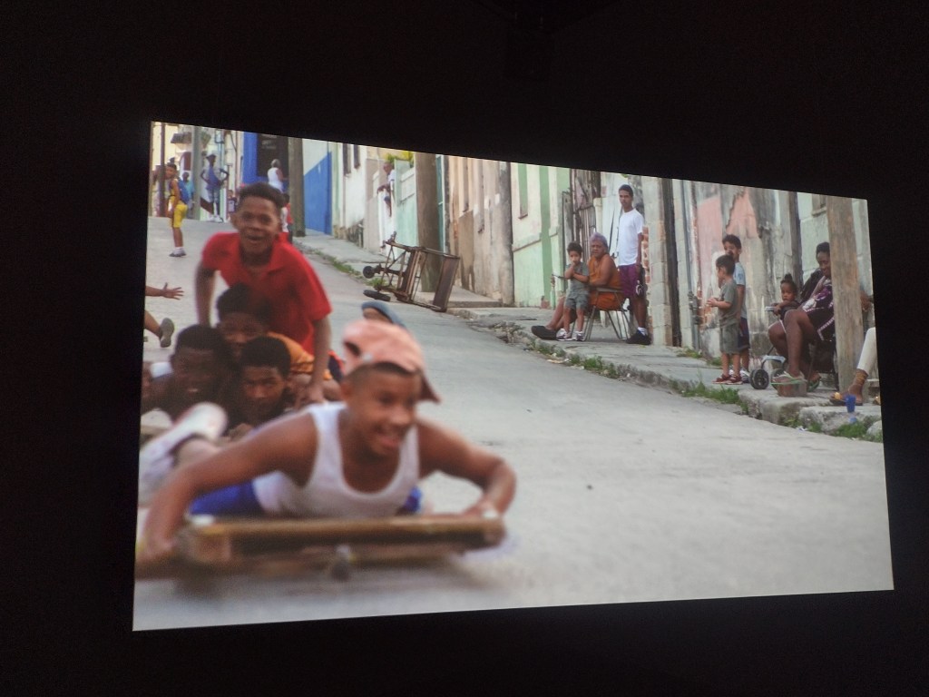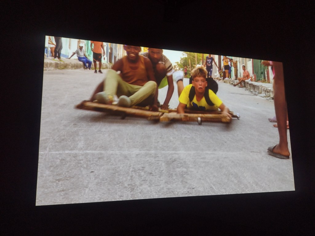 The smaller gallery space housed Amie Siegel’s Bloodlines (2022). I don’t normally engage video art for long, I’m naturally impatient. Here though, in the shade and darkness I was completely captivated by the luxurious interiors of Seigel’s film. Unnarrated, the camera drifts eerily along magnificently decorated hallways and into rooms with ticking clocks, marble pillars and strange taxidermied animal collections. We see an ‘insider’ view of huge stately homes, that are choc-full of artworks. It felt very apt that Bloodlines, which traces the movement of artworks by George Stubbs between private collections and public museums but really explores wealth, history, the legacies of ownership, class, and the strange power dynamics of who owns art and who can look at, and on whose terms that is, felt an important nod to where we were: the art collection of an actual Duke, (because yes, they’re still around), in the middle of a field in England.