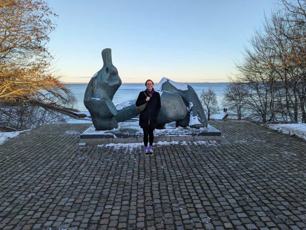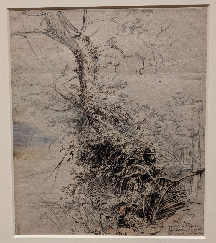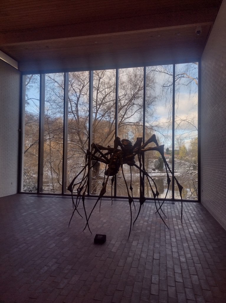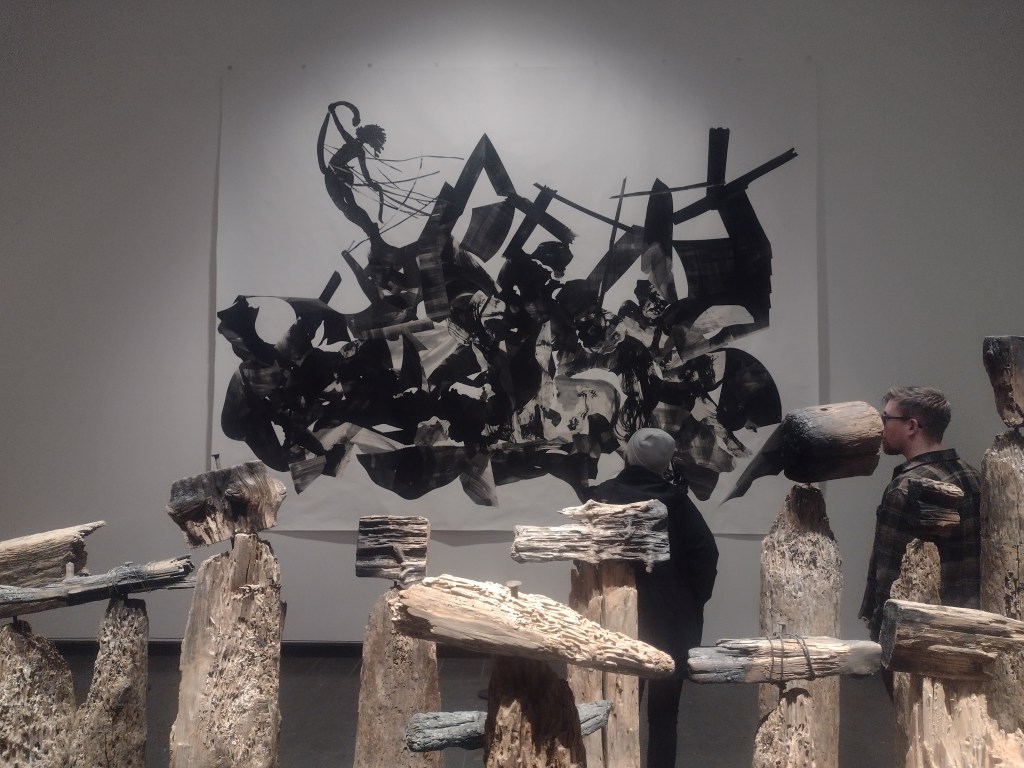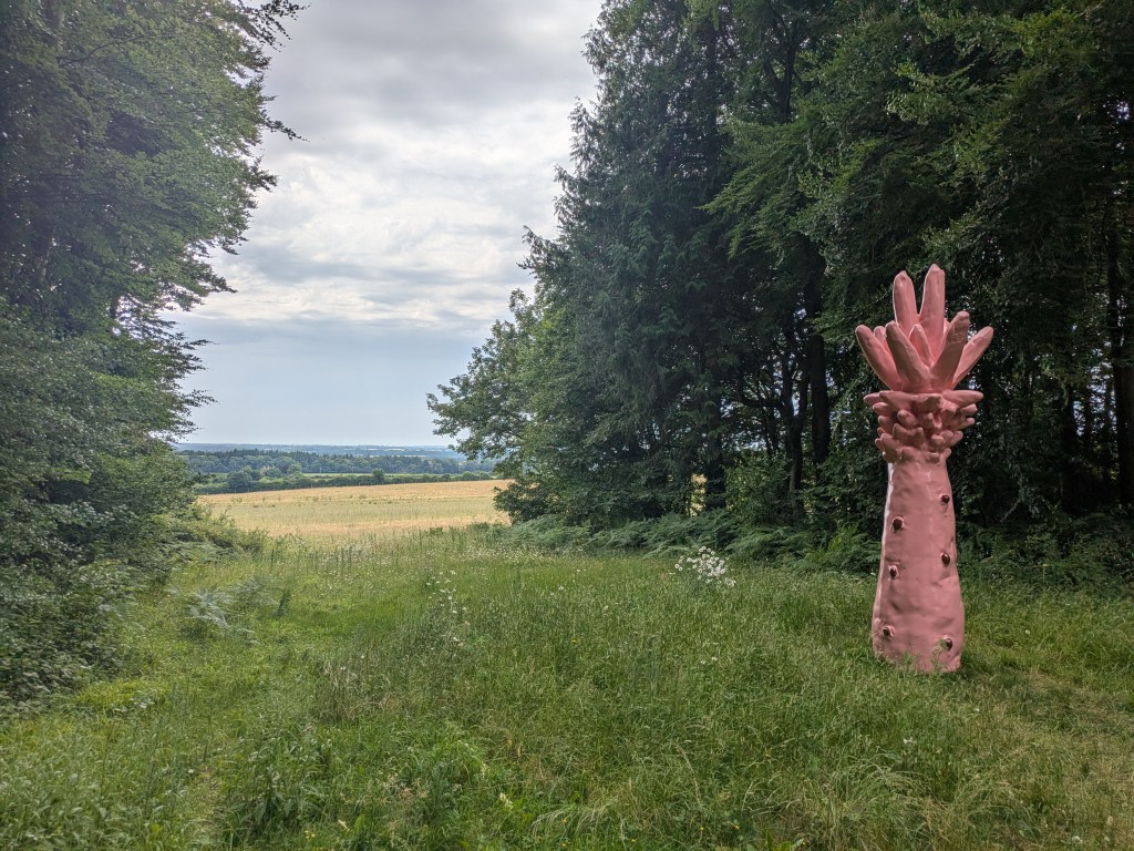 Back outside, my Dad and I strolled around at an easy pace, enjoying the vistas through the woods and occasionally playing a game of “is it an artwork or is it a nicely arranged pile of wood?” The landscape gardener, Dan Pearson, clearly has a nuanced understanding of the playful boundary between them. I enjoyed the exploration of materials and fragility in Veronica Ryan’s Magnolia Blossoms (2025) a circle of fallen petals and buds made from bronze. Rose Wylie’s Pale-Pink Pineapple/Bomb (2025) isn’t my type of thing, but looked pleasantly incongruous in the landscape. Unfortunately, Hélcio Oiticica’s Magic Square #3 (1978) was not yet open for exploration, but I’ll go back.